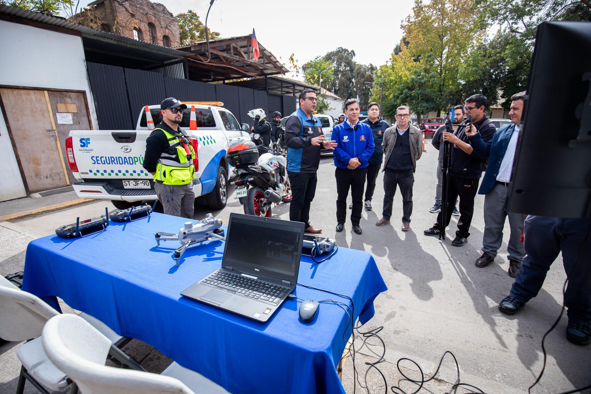 Durante la actividad, el equipo municipal presentó ante los medios de comunicación los implementos adquiridos en este período, entre ellos 6 camionetas, 2 motos, la central de televigilancia con cámaras activas en distintos puntos de la ciudad y 3 drones utilizados en operativos conjuntos con Carabineros y la PDI, incluyendo fiscalizaciones, allanamientos e incautaciones de drogas.