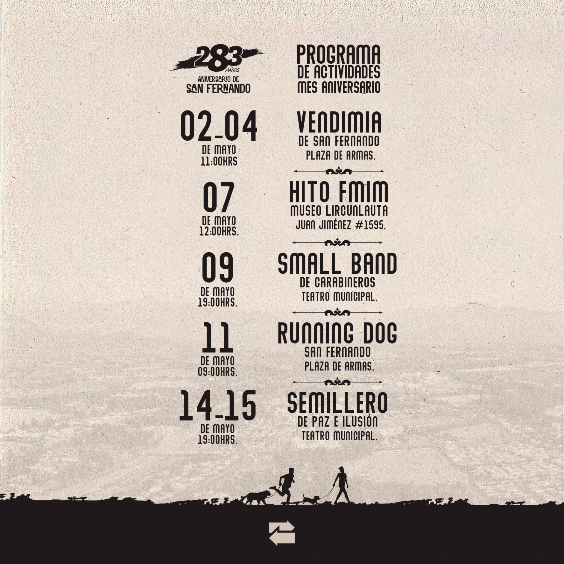 El domingo 11 de mayo será el turno de la ya tradicional Running Dog, y entre el 12 y el 16 de mayo se desarrollarán diversas iniciativas en el marco de la Semana de la Educación Artística, con la participación de establecimientos educacionales y artistas locales.