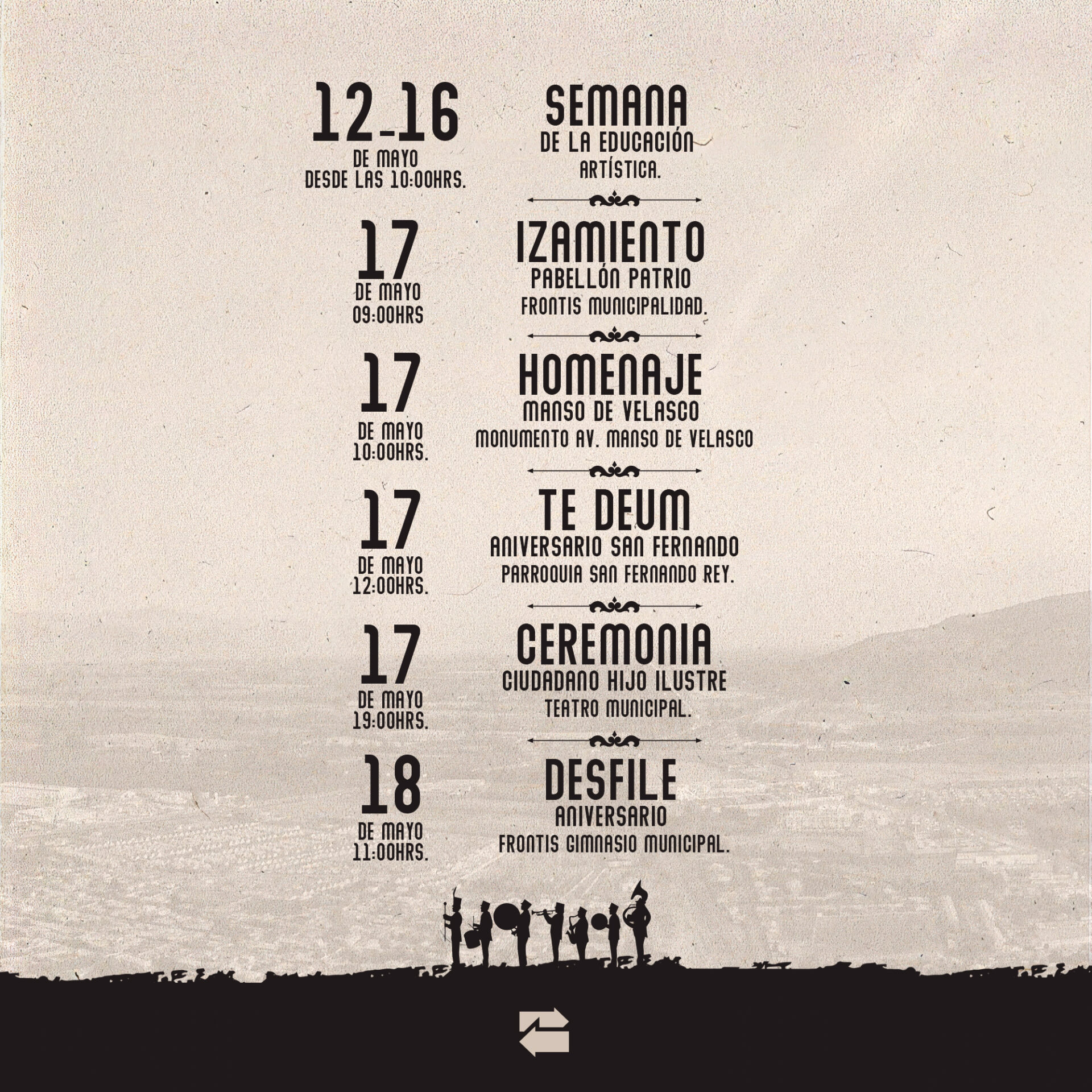 Las celebraciones continuarán el sábado 18 de mayo con el gran Desfile de Aniversario en la Avenida Manso de Velasco, donde participarán las distintas ramas de las Fuerzas Armadas, Bomberos, agrupaciones folclóricas y colegios de la comuna, junto con la presentación especial de la Escuela de Alta Acrobacia Halcones.