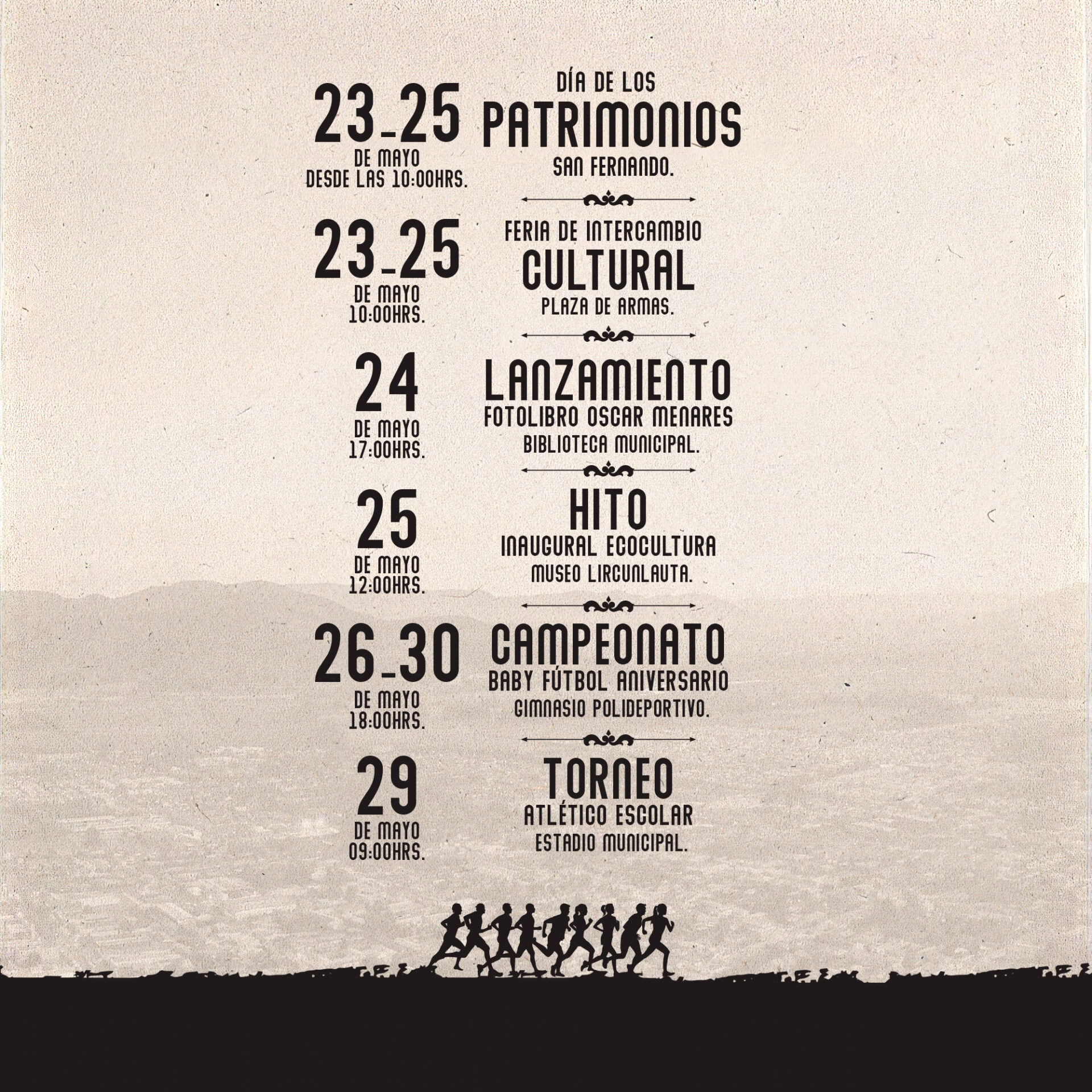 Finalmente, como ya es tradición, la última semana de mayo estará dedicada al Día de los Patrimonios, con una serie de actividades destacadas como el lanzamiento de un libro en la Biblioteca Municipal (24 de mayo), una Feria de Intercambio Cultural (23 al 25 de mayo), y, además, torneos de baby fútbol y atletismo.